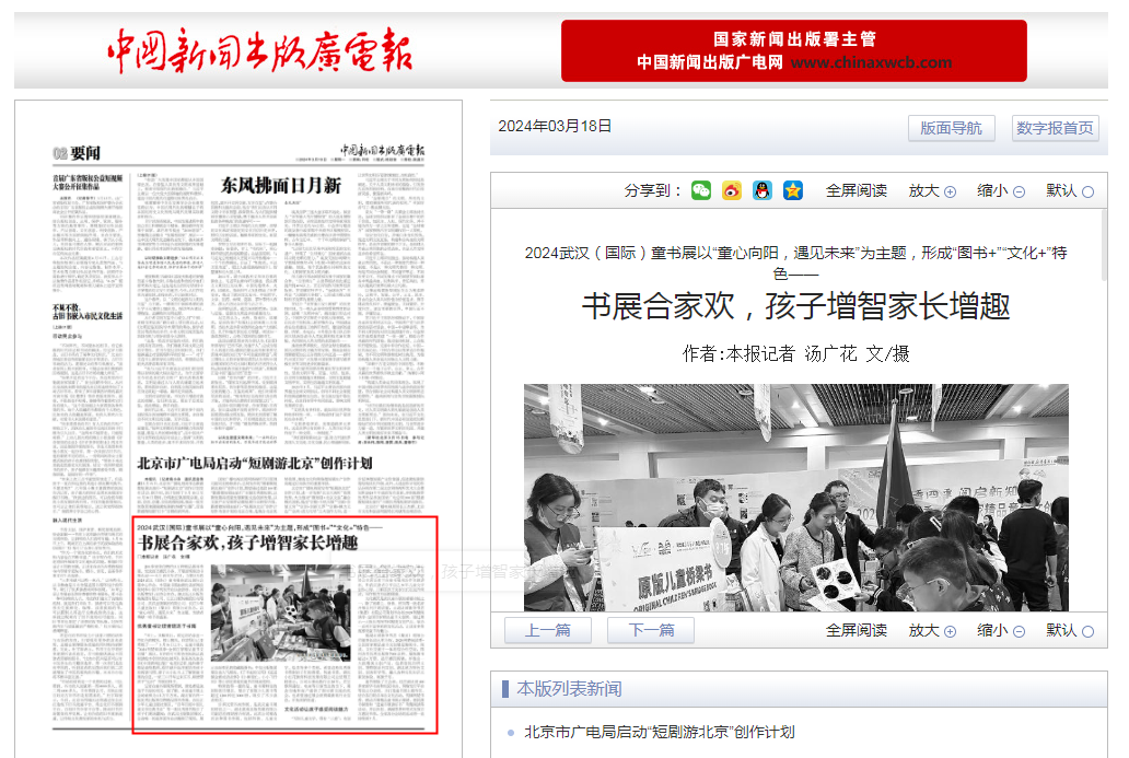 中國新聞出版廣電報∣2024武漢(國際)童書展以“童心向陽,遇見未來”為主題,形成“圖書+”“文化+”特色——書展合家歡,孩子增智家長增趣