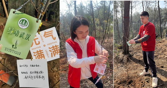 志愿者們分工明確,協同作戰,有的揮鍬挖土,有的提苗踩實;有的培土圍堰,有的提水澆水——經過一上午的辛勤勞動,在大家的共同努力下,一片元氣滿滿的小樹苗在山坡上“安家落戶”。青年志愿者們紛紛通過“武漢全民義務植樹”小程序認領了自己種植的小樹苗,并將認領卡和心愿卡掛在樹苗上,期盼夢想與樹苗一起生根發芽、蓬勃生長。