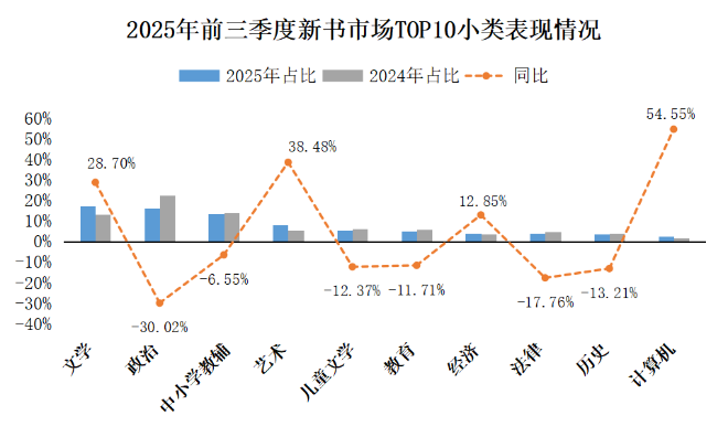 2025年前三季度,圖書市場各大類圖書仍然呈現下降趨勢,且除文藝類、經管類外,其余品類降幅均有所擴大。其中,文藝類降幅較上半年略有所收窄,主要是得益于部分新品如《啟示路》、《盜墓筆記(長白山紀念版)》的熱銷拉動。