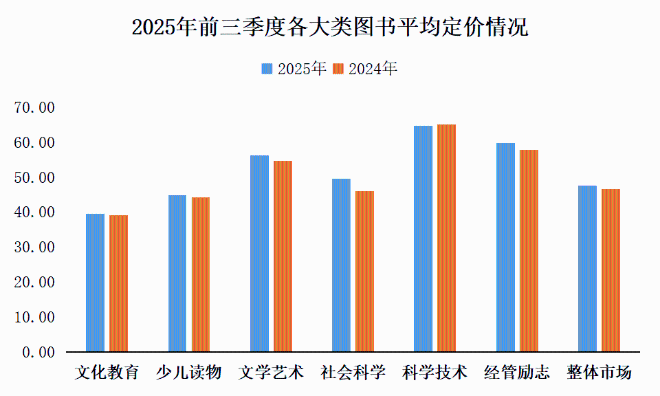 2025年前三季度圖書整體市場的平均定價47.56元,較去年同期上升1.86%。各大類圖書平均定價均有所上升,其中社科類增幅較大,定價同比上升7.44%。