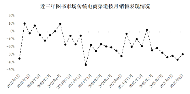回顧2023年起至今圖書市場的傳統電商渠道發展態勢,渠道整體持續處于下行通道,在傳統意義上對圖書銷售具有顯著帶動作用的促銷季、開學季、暑期檔等關鍵營銷節點,市場表現仍未達預期,未能形成有效銷售增長動能。隨著電商平臺促銷活動周期不斷拉長、促銷形式趨于常態化,消費者對促銷節點的敏感度逐步降低,購物決策行為呈現出分散化、常態化特征,傳統銷售旺季的消費活力明顯衰退。特別是今年第二季度及第三季度,傳統電商渠道同比降幅進一步擴大,其中第三季度各月降幅均在30%以上,主流電商平臺(天貓、京東、當當等)集體承壓。