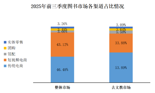 2025年前三季度整體圖書市場中,各渠道占比呈現穩定格局。其中,傳統電商和短視頻電商渠道占比接近1:1,二者共同構成圖書市場的核心銷售渠道,在整體市場份額中占據主導地位。