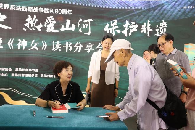 活動高潮部分是葉梅女士的分享與讀者互動。葉梅女士深情講述了《神女》的創作初衷、采風經歷以及在書寫那段悲壯歷史時的深刻感悟。她特別提到恩施這片英雄土地和三峽壯美山河給予她的靈感與震撼,并圍繞“銘記歷史、熱愛山河、保護非遺”主題,與現場讀者進行了真摯而熱烈的交流。讀者們踴躍提問,表達了對作品的喜愛和對歷史的思考,現場氣氛莊重而溫馨。分享會后,葉梅女士熱情地為現場讀者簽名留念。