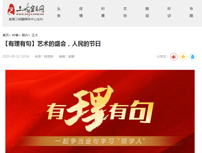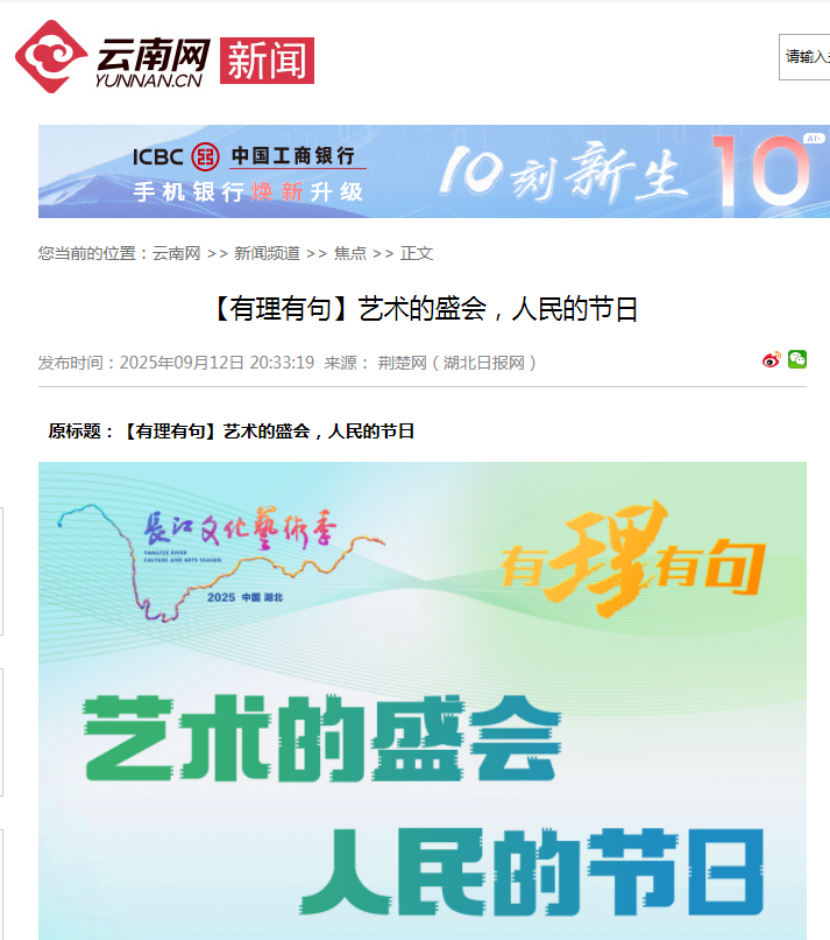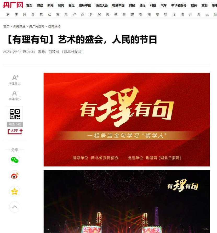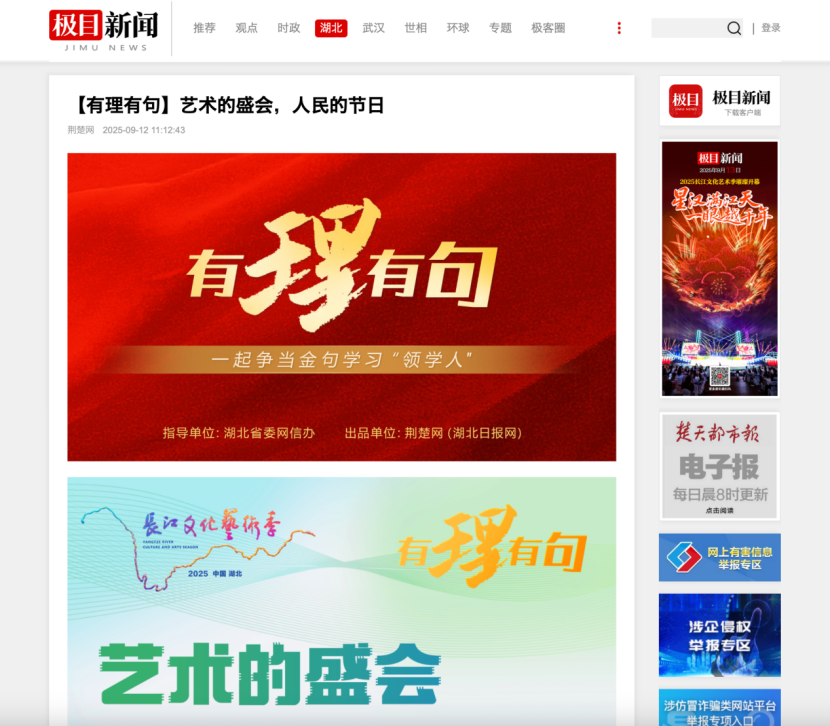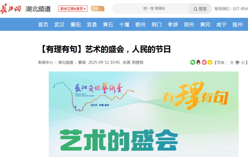 9月12日晚,2025長江文化藝術季盛大啟幕。由湖北省委網信辦指導,湖北省新華書店(集團)有限公司、荊楚網(湖北日報網)特別策劃“書香長江”閱讀周預熱視頻《【有理有句】藝術的盛會,人民的節日》,著名歷史學者紀連海邀約廣大市民讀長江、讀歷史、讀中國,成為當晚的熱點話題。