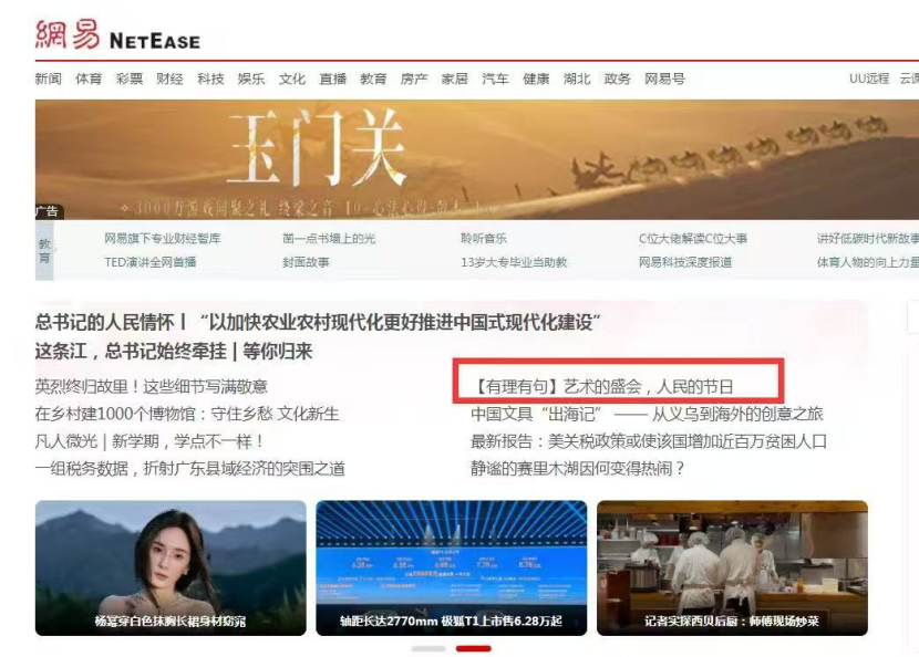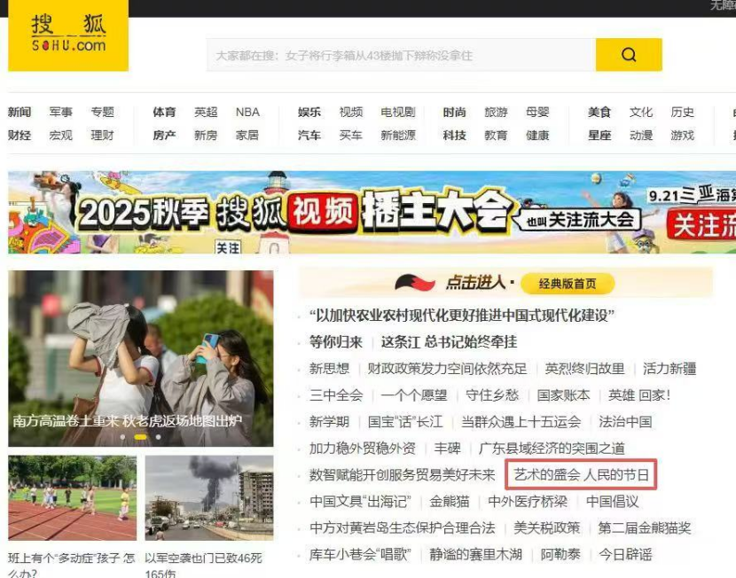 預熱視頻一經發布,即獲全網轉發推薦。據大數據中心監測數據顯示,截至9月13日中午,189家中央、省市級媒體報道《【有理有句】藝術的盛會,人民的節日》相關新聞,綜合Alexa網站排名、網站流量、網站訪問量、頁面瀏覽量等指標計算,該報道曝光量超過5800萬,形成刷屏式傳播。其中,新浪、騰訊、網易、搜狐、鳳凰網五大門戶網站在首頁首屏置頂。