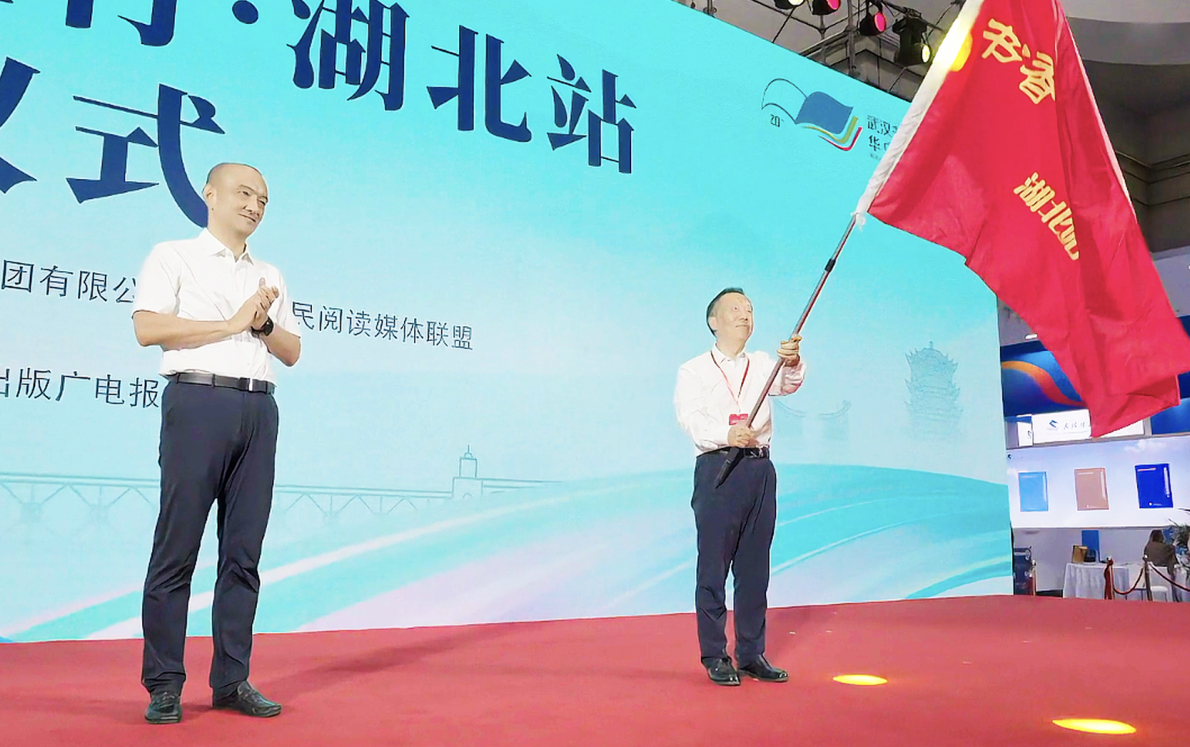 啟動儀式上舉行了“書香中國萬里行·湖北站”授旗儀式。中國新聞出版傳媒集團有限公司副總經理武遠明向湖北省委宣傳部副部長蔡靜峰授旗。雙方共同展旗,旗幟迎風飄揚,象征著全民閱讀品牌——“書香中國萬里行”巡回采訪活動在荊楚大地正式啟航。