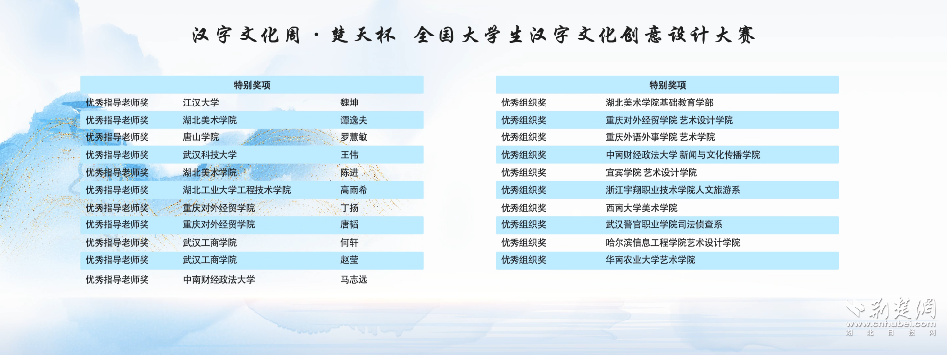 活動現場,首屆“漢字文化周·楚天杯”全國大學生文化創意設計大賽和“長江好物系列評選”的獲獎作品發布與頒獎環節備受矚目。湖北省新華書店(集團)有限公司黨委委員、副總經理柏濤、漢字文化周活動組委會主任楊文博為大學生大賽獲獎者頒獎,年輕創作者們以創新思維融合漢字文化與現代設計,展現無限創意潛力;中國出版傳媒商報社副總經理倪成、湖北省曲藝家協會主席陸鳴為“長江好物”獲獎單位和個人頒獎。獲獎作品涵蓋多個領域,體現長江流域文化內涵與藝術魅力,為產業發展樹立標桿。