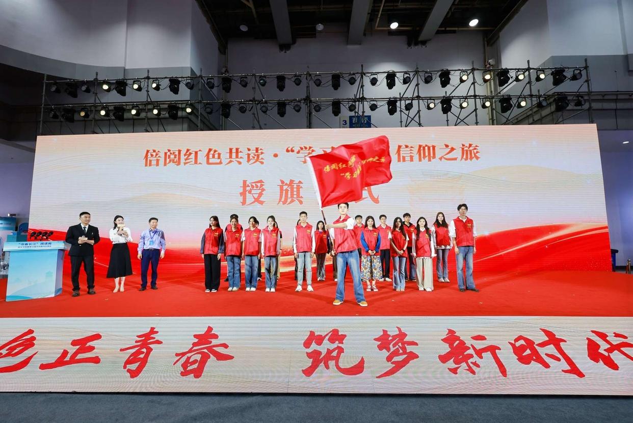 省委講師團主任姚亭華向大學生代表授予“紅色共讀·信仰之旅”旗幟,象征紅色精神薪火相傳。