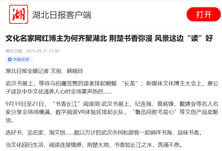 湖北日報客戶端 | 文化名家網紅博主為何齊聚湖北 荊楚書香彌漫 風景這邊“讀”好
